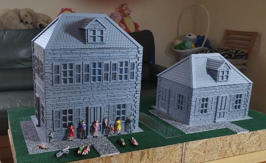 Drugim działaniem, podjętym od początku roku była budowa modułowej makiety modelarskiej. Czas gonił, bo makieta szykowana była na Piknik Modelarski i miała być jego jedną z głównych atrakcji. Do zbudowanych jesienią 2024 modułowych skrzynek przyklejaliśmy nawierzchnie, imitację dróg, rzek, traw. Projektowaliśmy i drukowaliśmy budynki, wiatraki, elementy architektury. Całość wyszła znakomicie.