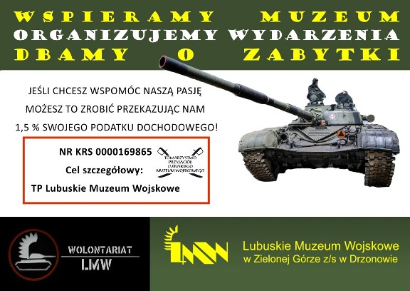 Nasze Towarzystwo Przyjaciół Lubuskiego Muzeum Wojskowego w Zielonej Górze z/s w Drzonowie, jest członkiem Związku Lubuskich Organizacji Pozarządowych, dzięki czemu możesz wesprzeć nas w naszych działaniach, przekazując nam 1,5 % swojego podatku dochodowego.