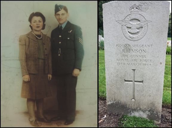 Links: Feldwebel Ronald Emson mit seiner Frau Helen, die er am 31. Oktober 1942 geheiratet hatte. Rechts: Die Grabplatte von Feldwebel Ronald Emson auf dem Friedhof in Koksijde (Quelle: Internet)