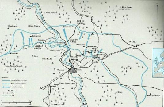 Am Morgen des 21. Februar 1916 leitete ein stundenlanger Artillerieangriff die um mehr als eine Woche verspätete Operation „Gericht“ ein. Die kühnen Angriffe der Deutschen stießen auf den heldenhaften Widerstand der Franzosen, was dazu führte, dass diese Kämpfe – nicht ohne Grund – von der Nachwelt als „Fleischwolf“ bezeichnet wurden. Am 25. Februar fiel einer der wichtigsten Stützpunkte des französischen Widerstands – Fort Douaumont. Das war ein Alarmsignal. Am selben Tag übernahm General Ph. Pétain das Kommando über die gesamten Verteidigungsmaßnahmen. Eilig wurden über die sogenannte „Heilige Straße“ neue Divisionen, Kampfausrüstung und Munition nach Verdun herangeführt. Ende Februar gelang es, die deutsche Offensive aufzuhalten. Im folgenden Monat verstärkten auch die Deutschen ihre Truppen, was zu einem Kräftegleichgewicht führte. In den folgenden Wochen tobte ein klassischer Vernichtungskrieg, bei dem keine Mittel gescheut wurden. Die Bilanz war für die Soldaten des Kaisers verheerend – um den Preis von 200.000 Toten und Verwundeten drangen sie 7 km tief in die französischen Stellungen vor.