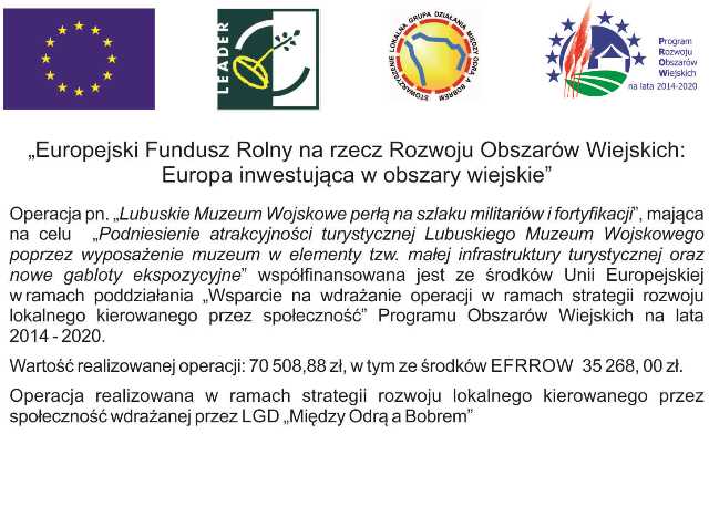Das Projekt mit dem Titel „Das Militärmuseum Lubuskie – eine Perle auf dem Weg der Militaria und Befestigungsanlagen“, dessen Ziel es ist, „die touristische Attraktivität des Militärmuseums Lubuskie durch die Ausstattung des Museums mit Elementen der sogenannten kleinen touristischen Infrastruktur sowie neuen Vitrinen zu steigern“, wird aus Mitteln der Europäischen Union im Rahmen der Teilmaßnahme „Unterstützung für die Umsetzung von Maßnahmen im Rahmen der von der örtlichen Bevölkerung betriebenen Strategie zur lokalen Entwicklung“ des Programms für den ländlichen Raum für die Jahre 2014–2020 kofinanziert.