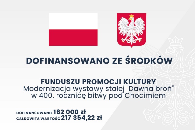 „Projekt: Modernisierung der Dauerausstellung „Alte Waffen“ zum 400. Jahrestag der Schlacht bei Chocim. Gefördert aus Mitteln des Ministers für Kultur, Nationales Erbe und Sport aus dem Kulturförderungsfonds – einem staatlichen Zweckfonds“