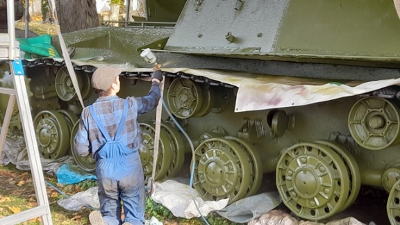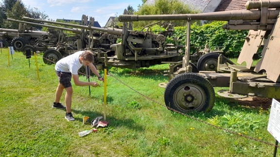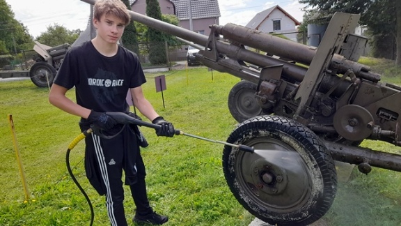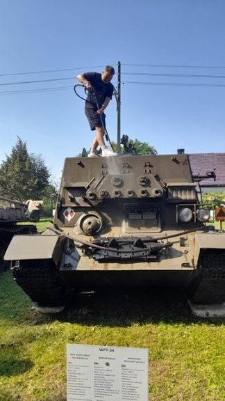 Our work also involves the systematic maintenance of the heavy military equipment display. During the summer holidays, Kuba and Tomek spent two weeks at the museum. During this time, they washed all the artillery equipment, repainted the boundary posts, and dusted and waxed the vehicles in the exhibition hall. During this period, we also washed the vehicles from the engineering equipment collection. We supported the museum with its autumn tidying-up work and in preparing the exhibits for winter. Here, once again, Piotrek’s help was invaluable; he removed the batteries, drained the water from the cooling systems, and covered the vehicles with tarpaulins (and even managed to get hold of a few new ones himself!).